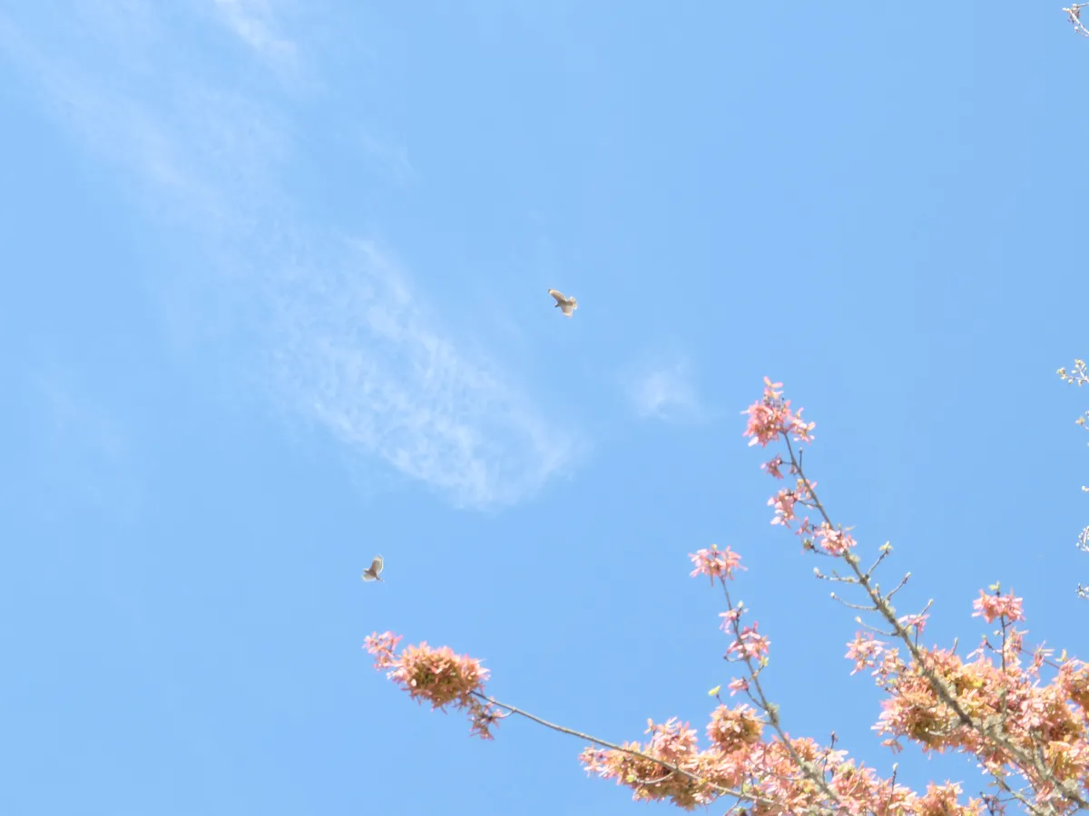 I spotted two large birds soaring & swooping together during my lunch stroll, and snapped a picture in hopes of getting enough detail that I could identify them later on. Between the Merlin Bird ID app,3 judicious googling, and some zoom & enhance, the 4-5 bold white and black bands on their tails gave them away as being red-shouldered hawks. Merlin says they're "unlikely" in this area at this time of year but I saw what I saw.
